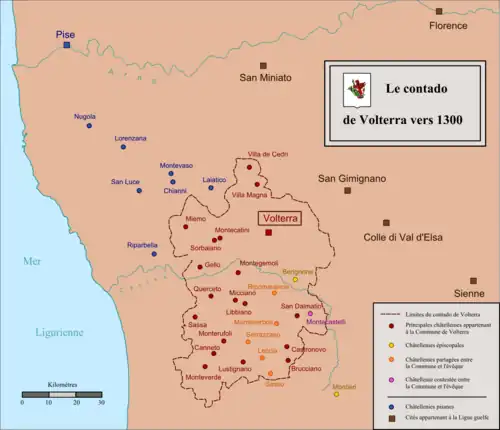 - ↑ Le diocèse de Volterra recouvrait un territoire plus vaste que le contado de la république. Ainsi, il incluait par exemple également le contado de San Gimignano.