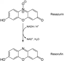 La résazurine (appellation chimique 10-oxyde de 7-hydroxy-3H-phenoxazin-3-one) est un indicateur coloré bleu, faiblement fluorescent[3] jusqu'à ce qu'il soit réduit de manière irréversible en résorufine, un indicateur coloré rose fortement fluorescent dans le rouge. La résazurine est utilisée comme indicateur d'oxydo-réduction lors des tests de viabilité cellulaire permettant de déterminer si une cellule est aérobie ou anaérobie[4]. Cet indicateur coloré peut se trouver communément dans le commerce sous forme de sel de sodium.