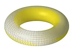 Une manière simple de voir les choses est de se limiter à la dimension 2. Les points de première coordonnée égale à un entier sont identifiés avec les points de première coordonnée égale à 0. Cela revient à enrouler l'espace pour obtenir un cylindre où tous les points de première coordonnée entière sont superposés. On identifie alors les points de deuxième coordonnée égale à un entier aux points de deuxième coordonnée égale à 0. Cela revient à enrouler le cylindre pour obtenir un tore, illustré sur la figure 7.