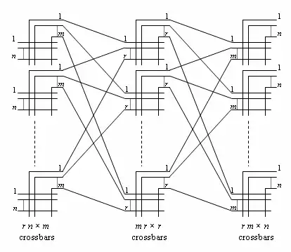 Les réseaux Clos sont architecturés en trois niveaux : ingress (entrée) , middle (intermédiaire) et egress (sortie). Chaque étage est construit avec un certain nombre de switches en crosssbar (voir diagramme), appelés souvent crossbars. Chaque appel entrant dans un commutateur ingress peut être routé via un commutateur middle vers le commutateur egress correspondant à la destination. Un commutateur middle n'est utilisable que si le lien ingress-middle et le lien middle-egress sont disponibles.