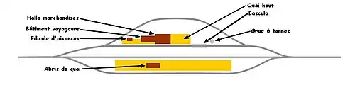 - ↑ Le bâtiments voyageurs (appelé également BV) est celui qui regroupe les services pour les voyageurs. C'est ce qui est appelé dans le langage courant « gare ».