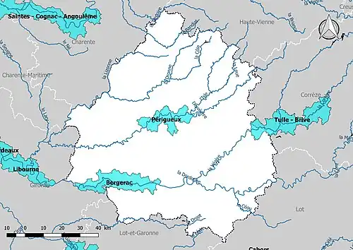 Le réseau hydrographique de la Dordogne est constitué de plus de 5 000 km de cours d'eau[3] et comprend 96 cours d'eau de longueur supérieure à 10 km, dont 12 de longueur supérieure à 50 km. Il est situé entièrement dans le bassin administratif Adour-Garonne et est découpé dans le schéma départemental des rivières en huit bassins versants principaux appartenant à trois régions hydrographiques. Le découpage de ces bassins correspond aux unités hydrographiques de référence (UHR) définies dans le schéma directeur d'aménagement et de gestion des eaux (Sdage) du bassin Adour-Garonne[4], seul le bassin de l'Isle a été divisé en deux (Isle amont et Isle aval) pour tenir compte de certaines spécificités[5] :