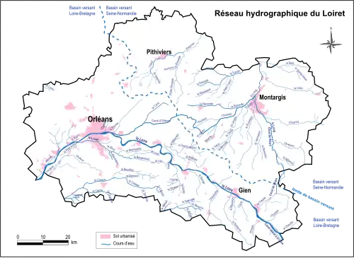 La base de données Carthage est le référentiel du réseau hydrographique français. Cette base est réalisée à partir de la couche hydrographie de la base de données Carto enrichie par le ministère chargé de l'environnement et les agences de l'eau avec le découpage du territoire en zones hydrographiques d'une part et la codification de ces zones et du réseau hydrographique d'autre part[3]. De cette base, il ressort que le réseau hydrographique du Loiret comprend plus de 4 800 kilomètres de cours d’eau non domaniaux, 140 kilomètres de cours d’eau domaniaux (la Loire et l’aval du Loiret) et 470 kilomètres de canaux[4].