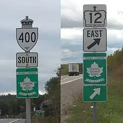 La route transcanadienne parcourt plusieurs tracés majeurs au Canada. Les gouvernements provinciaux sont entièrement responsables de la signalisation et de l'entretien de ces routes, sauf dans les Parcs nationaux. Le réseau est indiqué avec des panneaux verts présentant une feuille d'érable partout au Canada. Alors que les autres provinces apposent simplement le numéro de la route à l'intérieur dela feuille d'érable, l'Ontario place les panneaux du réseau transcanadien au-dessous ou à côté des panneaux routiers provinciaux. L'intérieur de la feuille d'érable est laissé vide ou rempli par un nom; la Central Ontario Route, la Georgian Bay Route, la Lake Superior Route, la Northern Ontario Route et la Ottawa Valley Route.