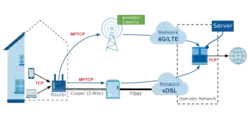 Une autre solution utilise Multipath TCP (MPTCP), une évolution récente du protocole TCP. MPTCP a été conçu pour assurer la transmission des paquets d’une session spécifique via différentes routes. Plus précisément, les serveurs proxy Multipath TCP sont installés sur le routeur hybride et sur le HAG. Quand l’utilisateur utilise un routeur hybride qui initie une session TCP, cette session est convertie automatiquement en session Multipath TCP permettant l’utilisation de plusieurs routes. Cette session est ensuite reconvertie en TCP par le HAG avant d’être acheminé vers le serveur final de l’opérateur.
