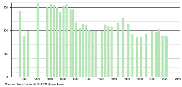 L'évolution du nombre d'habitants est connue à travers les recensements de la population effectués dans la commune depuis 1793. Pour les communes de moins de 10 000 habitants, une enquête de recensement portant sur toute la population est réalisée tous les cinq ans, les populations de référence des années intermédiaires étant quant à elles estimées par interpolation ou extrapolation[26]. Pour la commune, le premier recensement exhaustif entrant dans le cadre du nouveau dispositif a été réalisé en 2005[27].