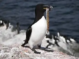 Un petit pingouin repose sur Gannet Island avec un poisson dans son bec