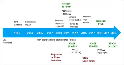 Sur le territoire du Marais poitevin, les bassins du Lay, de la Vendée et de l'Autize ont, à partir des années 2000, mis en œuvre des programmes d’actions pour un retour à une gestion équilibrée de la ressource comprenant la construction de réserves de substitution : d'abord le programme des Autizes (2006-2011), puis le CTGQ de la Vendée (2014-2019) et le CTGQ du Lay (2014-2018). Ils ont été suivis par des programmes concernant les deux autres bassins constituant le territoire : le CTGQ Sèvre Niortaise et Mignon (2018-2022) et le CTGQ du bassin du Curé (2016-2020), chacun étant assorti de projets de constructions de réserves. Une évaluation en a été faite en 2021 par un groupements de bureaux d'études d"hydologie pour le compte de l'agence de l'eau Loire-Bretagne[40]. Chacun de ces programmes est détaillé par bassin ci-après