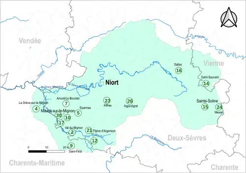 - ↑ « Contrat territorial Sèvre Niortaise et Mignon - Aides et redevances - Agence de l'eau Loire-bretagne », sur aides-redevances.eau-loire-bretagne.fr (consulté le ).