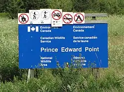 Les réserves nationales de faune sont identifiées par des panneaux bleu et blanc représentant un plongeon huard, l'oiseau emblématique du Service Canadien de la Faune.
