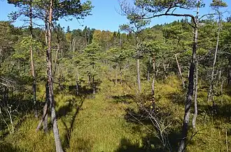 La tourbière se situe à environ 30 mètres au-dessus du niveau de la mer, tandis que les collines environnantes atteignent entre 70 et 90 mètres de haut. Des excroissances naines de pins et de bouleaux poussent sur la tourbière. Dans les endroits les plus humides, il y a des marécages avec des iris des marais[2].