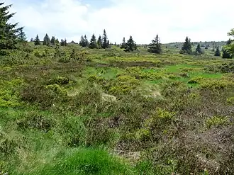 - Des anciennes prairies d'altitude, du moins ce qui reste de la strate herbacée des anciennes chaumes broutées, envahies de landes à éricacées (bruyères et canneberges), l'ensemble étant baptisé hautes chaumes par les biologistes.