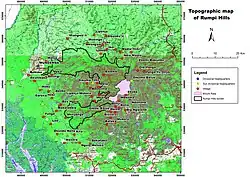 La limite nord est la route de Lipenja Mukete à Madie I en passant par Ikoi et Dikome Ngolo. La limite sud passe par Nalende, Monyange, Itoki et Ilor jusqu'à Moko. La frontière orientale passe par Dikome-Balue, Mofako, Itende et Bisoro. Enfin, la limite ouest passe par Dibonda, Ndian et Ituka jusqu'à Lipenja, qui est aussi le point de départ de la réserve[2]. Ces limites donnent à la réserve forestière de Rumpi Hills une forme de fer à cheval.