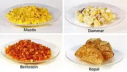 On distingue les résines actuelles, fossiles ou semi-fossiles et fossiles récentes. Alors que les résines récentes proviennent d'arbres encore vivants aujourd'hui (térébenthine, baumes (en), gomme laque, colophane, sandaraque et mastic), les résines fossiles récentes sont issues d'anciens représentants d'espèces d'arbres, dont certaines existent encore aujourd'hui. Celles-ci sont appelées « copals ». La résine fossile est appelée « ambre ». Les arbres d'origine ne peuvent généralement plus être identifiés. On pense que l'ambre de la Baltique provient d'une espèce préhistorique de conifère. Les résines fossiles sont peu solubles dans l'alcool.