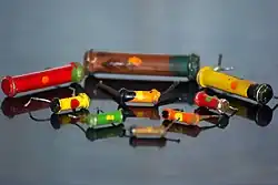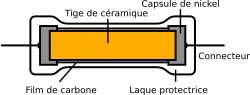 Ces résistances étaient constituées d'un bâtonnet de carbone aggloméré. Un fil de connexion est enroulé à chaque extrémité. Leur valeur est donnée par un code de couleurs qui se lit dans l'ordre : corps, extrémité, point. Le point est le multiplicateur. Leur tolérance est généralement de 20 % ou de 10 % si l'autre extrémité est argentée. La puissance que peuvent dissiper ces résistances dépend de leur taille. Par exemple, une résistance quart de watt a un diamètre de 5 mm et une longueur de 18 mm. Ce type de résistance a été développé dès le début de la radio et abandonné dans les années 1950. Seul leur code de couleurs a été conservé sous la forme d'anneaux.