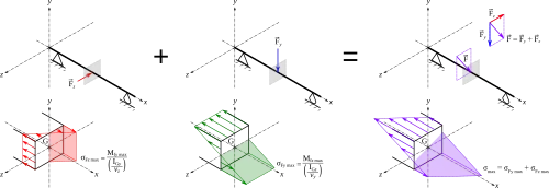 Dans la résistance des matériaux, les contraintes normales ne sont dues qu'à l'effort normal et aux moments de flexion. Dans la théorie des poutres, les contraintes normales dans une section droite sont calculées dans un repère Gxyz où G est le centre de gravité de la section droite, l'axe Gx est tangent à la fibre neutre de la poutre, les repères Gy et Gz sont les axes principaux d'inertie.