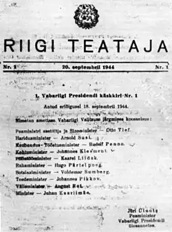 Le mouvement a ensuite formé le Comité national de la république d'Estonie (estonien : Eesti Vabariigi Rahvuskomitee) en [7]. L'initiative originale de former le comité est venue des partis d'opposition estoniens d'avant-guerre, mais elle fut rapidement rejointe par Jüri Uluots, le dernier Premier ministre constitutionnel d'avant-guerre de la république d'Estonie et ses partisans. Le Comité visait à établir un gouvernement provisoire pendant le retrait prévu de l'Allemagne, l'Armée rouge ayant atteint la frontière de l'Estonie le . En , un grand nombre de membres du comité furent arrêtés par les agences de sécurité allemandes[11]. Alors qu'environ 200 personnes furent emprisonnés, les chefs du mouvement de résistance échappèrent à l'arrestation, restreignant cependant sévèrement leurs activités jusqu'à la mi-juin[12]. En , l'assemblée électorale de la république d'Estonie s'est réunie en secret auprès des puissances occupantes à Tallinn et celle-ci nomma Jüri Uluots au poste de Premier ministre avec les responsabilités du président. Le , Jüri Uluots nomma Otto Tief vice-Premier ministre. Le , Uluots, atteint d'un cancer, nomma Otto Tief Premier ministre par intérim et créa un gouvernement composé de 11 membres. Tief prit ses fonctions conformément à la Constitution et profita du départ des Allemands pour déclarer le gouvernement légitime estonien rétabli. Le gouvernement national estonien fut proclamé en Estonie, les unités militaires estoniennes saisirent les bâtiments gouvernementaux à Toompea en ordonnant aux forces allemandes de quitter le pays[13]. Le drapeau de l'Allemagne fut remplacé par le drapeau tricolore estonien dans le Pikk Hermann, la tour du drapeau du siège du gouvernement. Le gouvernement de Tief échoua cependant à garder le contrôle, tentant d'organiser la défense de la capitale contre l'avancée de l'Armée rouge en utilisant les hommes ayant combattu dans le régiment d'infanterie finlandais n° 200 et une unité militaire organisée par Johan Pitka[14]. Les Allemands envahirent le quartier général de l'amiral Pitka à Tallinn et celui-ci fut présumé tué par la bataille qui s'ensuivit[15]. La plupart des membres et des fonctionnaires furent arrêtés, emprisonnés, déportés ou exécutés par les Soviétiques en progression.