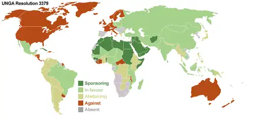 Après que le projet de résolution eut été adopté par le comité préparatoire et que les tentatives de reporter le vote eurent échoué, la résolution 3379 a été soumise à l'Assemblée générale des Nations unies pour un vote le 10 novembre 1975, sous le parrainage de la Ligue arabe et d'un certain nombre de pays à majorité musulmane, et avec un soutien principal par les votes favorables des pays du Seconde monde (bloc de l'Est) et de nombreux pays africains[9].