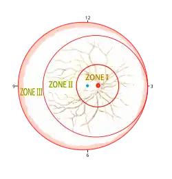 La rétinopathie du prématuré peut aussi être classifiée en fonction de la zone affectée. On distingue trois zones.