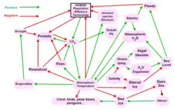 Les forçages et les rétroactions déterminent ensemble l'ampleur et la rapidité des changements climatiques. La principale rétroaction positive du réchauffement climatique est la tendance du réchauffement à augmenter la quantité de vapeur d'eau présente dans l'atmosphère, ce qui conduit à un accroissement de l'effet de serre et donc à un réchauffement plus important[6]. La principale réaction négative provient de la loi de Stefan-Boltzmann : la quantité de chaleur émise par la Terre dans l'espace évolue avec la puissance quatre de la température de la surface et de l'atmosphère de la Terre. Les observations et les modélisations montrent que le bilan net des rétroactions du réchauffement est positif[7]. Des rétroactions positives importantes peuvent produire des effets brusques ou irréversibles, selon le taux et l'ampleur du changement climatique[8].