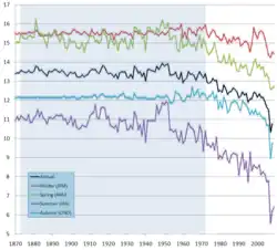 Le changement d'albédo est la principale raison pour laquelle le GIEC prévoit une augmentation des températures au pôle nord jusqu'à deux fois plus forte que celles du reste du monde, selon un processus connu sous le nom d'amplification polaire. En septembre 2007, la superficie de la calotte glaciaire arctique atteignait environ la moitié de la moyenne des superficies minimales relevées entre 1979 et 2000[63],[64]. Également en septembre 2007, la banquise arctique a tellement reculé que le passage du Nord-Ouest est devenu accessible à la navigation pour la première fois depuis le début de la période historique[65]. Les pertes record de 2007 et 2008 pourraient toutefois être temporaires[66]. Mark Serreze du Centre national de données sur la neige et la glace des États-Unis considère 2030 comme une « estimation raisonnable » du moment où la calotte glaciaire arctique estivale pourrait fondre complètement en été[67]. L'amplification polaire du réchauffement planétaire ne devrait pas se produire dans l'hémisphère sud[68]. La superficie de la calotte glaciaire antarctique a atteint en 2008 son maximum relevé depuis le début des observations en 1979[69], mais l'augmentation des glaces au sud ne compense pas la surface perdue au nord. La tendance au niveau mondial (hémisphères nord et sud cumulés) est clairement au recul des glaces[70].