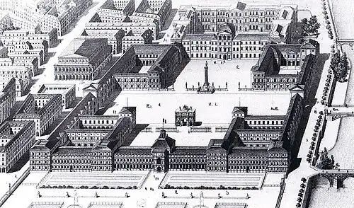 - d'aménager entre le Louvre et les Tuileries une immense place, à l'est et à l'ouest de laquelle des ailes nouvelles délimitant des cours de service étaient greffées à la cour carrée du Louvre et aux parties latérales des Tuileries.
