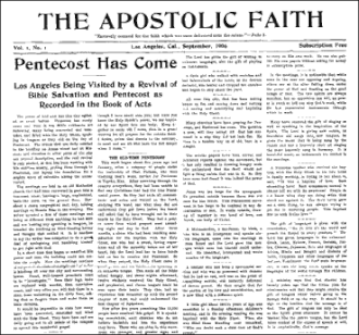 Dans une "une" pleine de scepticisme intitulée "Une étrange tour de Babel de langues", un journaliste du Los Angeles Times tentait de décrire ce qui serait bientôt connu comme le Réveil de Azusa Street : "Soufflant des paroles étranges et exprimant un credo qu'aucun mortel sain d'esprit ne saurait comprendre, la dernière secte religieuse a commencé à Los Angeles"[18]. Un autre journal local donnait en cette description des événements : « ...honteux mélange de races...ils pleurent et poussent des hurlements tout le jour et dans la nuit. Ils courent, sautent, tremblent de tous les côtés, crient à tue-tête, tournent en rond, tombent sur le plancher recouvert de sciure de bois, se débattent et se roulent partout. Certains d'entre eux s'évanouissent et ne bougent pas pendant des heures comme s'ils étaient morts. Ces gens semblent être fous, mentalement dérangés ou sous l'emprise d'un sortilège. Ils prétendent être remplis de l'Esprit saint. Ils ont un nègre borgne illettré comme principal prédicateur, qui reste à genoux la plupart du temps, la tête cachée entre les caisses de lait en bois. Il ne parle pas beaucoup mais on l'entend parfois crier « Repentez vous », et c'est lui qui, prétendument, dirige tout... Ils chantent de manière répétée le même chant, «Le consolateur est venu»[4]. »