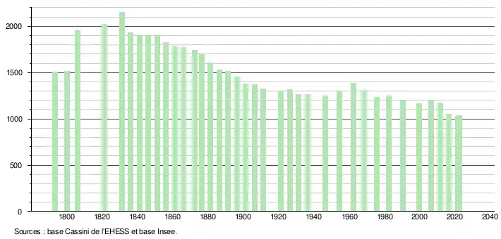 L'évolution du nombre d'habitants est connue à travers les recensements de la population effectués dans la commune depuis 1793. Pour les communes de moins de 10 000 habitants, une enquête de recensement portant sur toute la population est réalisée tous les cinq ans, les populations de référence des années intermédiaires étant quant à elles estimées par interpolation ou extrapolation[49]. Pour la commune, le premier recensement exhaustif entrant dans le cadre du nouveau dispositif a été réalisé en 2006[50].