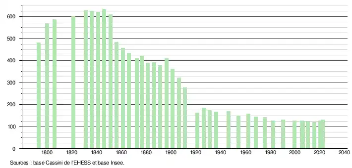 L'évolution du nombre d'habitants est connue à travers les recensements de la population effectués dans la commune depuis 1793. Pour les communes de moins de 10 000 habitants, une enquête de recensement portant sur toute la population est réalisée tous les cinq ans, les populations de référence des années intermédiaires étant quant à elles estimées par interpolation ou extrapolation[19]. Pour la commune, le premier recensement exhaustif entrant dans le cadre du nouveau dispositif a été réalisé en 2005[20].