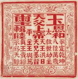 Par ailleurs, à partir de 1853, Hong Xiuquan cesse de s'impliquer activement dans la conduite des affaires : on parle même de chef « invisible ». Ce changement dans la direction du mouvement s'opère au bénéfice de Yang Xiuqing, le « Roi de l'Est » et « Conseiller militaire » ; celui-ci cumule en fait les pouvoirs de général en chef de l'armée Taiping et de premier ministre, au travers de son titre de « Seigneur des 9 000 ans »[31]. Hong Xiuquan ne règne plus que par des proclamations écrites essentiellement centrées sur des questions religieuses, à partir de son « palais du Roi céleste » à Nankin.