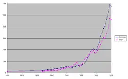 Dans les années 1840, les constructions ferroviaires connurent un premier apogée. Alors qu'en 1840, le réseau comptait 580 km de lignes, sa longueur atteignait déjà 7 000 km en 1850 et presque 25 000 km en 1870. Plus de 42 000 personnes étaient déjà employées en 1840 pour la construction et l'exploitation des lignes ferroviaires, c'est-à-dire plus que dans les mines de charbon. Ce chiffre continua à croître dans les années suivantes pour frôler les 180 000 dès 1846. Une part minime des effectifs, environ 26 000 travailleurs, étaient employés en permanence dans l'exploitation, le reste était occupé à construire les lignes[32],[33],[34].