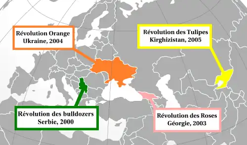 Les révolutions de couleur (de colour revolutions en anglais) sont une série de soulèvements populaires ayant eu lieu en Europe de l'Est et en Asie centrale entre 2000 et 2012 :