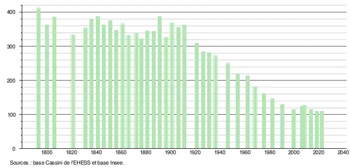 L'évolution du nombre d'habitants est connue à travers les recensements de la population effectués dans la commune depuis 1793. Pour les communes de moins de 10 000 habitants, une enquête de recensement portant sur toute la population est réalisée tous les cinq ans, les populations de référence des années intermédiaires étant quant à elles estimées par interpolation ou extrapolation[13]. Pour la commune, le premier recensement exhaustif entrant dans le cadre du nouveau dispositif a été réalisé en 2008[14].