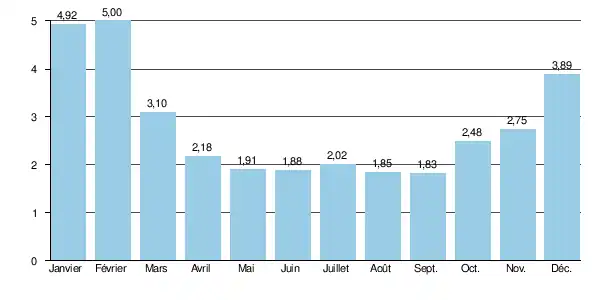 La lame d'eau écoulée dans le bassin atteint ainsi 44,5 mm par an, chiffre satisfaisant dans cette région assez peu arrosée (moyenne du bassin : 500 mm[2]). Quant au débit spécifique, il se monte à 1,41 litre par seconde et par kilomètre carré de bassin.