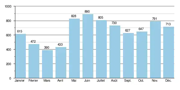 Le débit moyen mensuel observé en mars (minimum d'étiage) atteint 390 m3/s, soit à peine un peu moins de la moitié du débit moyen du mois de juin (890 m3/s), ce qui témoigne de la faible amplitude des variations saisonnières. Sur la durée d'observation de 19 ans, le débit mensuel minimal a été de 158 m3/s (), tandis que le débit mensuel maximal s'élevait à 1 920 m3/s en . Notons que les débits dus tant à la fonte des neiges qu'aux précipitations de la saison froide, sont largement régularisés par les nombreux lacs du bassin.