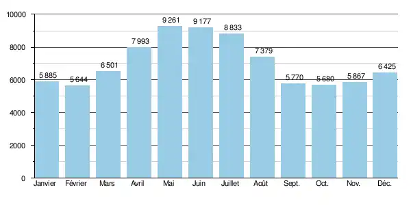 Le débit moyen mensuel observé en septembre (minimum d'étiage) atteint 5 680 m3/s, soit même pas 40 % de moins que le débit moyen du mois de mai (9 261 m3/s), mois du débit mensuel moyen maximal. Ceci témoigne de la faible amplitude des variations saisonnières. Sur la durée d'observation de 14 ans, le débit mensuel minimal observé a été de 2 054 m3/s, tandis que le débit mensuel maximal s'élevait à 11 835 m3/s.