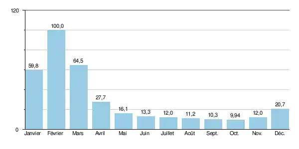 Le débit moyen mensuel observé en octobre (minimum d'étiage) est de 9,94 m3/s, soit plus ou moins 10 % du débit moyen du mois de février (100,0 m3/s), ce qui témoigne de l'amplitude assez importante des variations saisonnières. Sur la durée d'observation de 33 ans, le débit mensuel minimal a été de 8,0 m3/s à plusieurs reprises en septembre-octobre, tandis que le débit mensuel maximal s'élevait à 191 m3/s ().