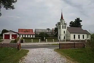 - Une église très modeste entourée d'une cour herbeuse vide et d'une clôture en bois. Le bâtiment est maintenant recouvert de nouvelles tuiles grises. Elle possède une tour intéressante - à l'origine cubique puis devenue prisme avec une base polygonale régulière - surmontée d'un simple casque. Sous la galerie, protégée par un garde-corps métallique, se trouvent cinq fenêtres hautes, étroites et terminées en arc de cercle. Des fenêtres beaucoup plus grandes, de conception similaire, sont vitrées avec du verre coloré et disposées en forme de croix, encadrée par une bordure unicolore. Elles permettent à la lumière du jour de pénétrer dans le sanctuaire.