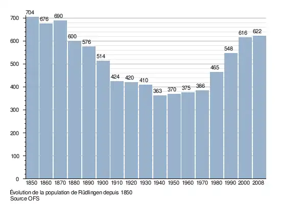 Le graphique suivant résume l'évolution de la population de Rüdlingen entre 1850 et 2008[3] :