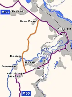 et Contournement d'Irkoutsk (Branche de la R255, vers la R258), km 1865- Fin de la R255, devient la route de Moscou à Vdovina en direction d'Irkoutsk, km 1866