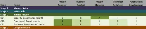 Les lignes de la matrice référencent les activités identifiées, et les colonnes les rôles (personnels impliqués par métier). Dans chaque cellule [activité ; rôle] figure la lettre « R », « A », « C » et/ou « I », où l'acronyme anglais RACI signifie :