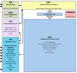 - GCN regroupe le matériel de shader en « unités de calcul » (CU) qui contiennent des ALU scalaires et des ALU vectorielles, LDS et un accès mémoire. Une CU contient 4 SIMD16 qui partagent un chemin vers la mémoire.
