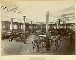 - ↑ Le Lusitania est en grande partie décoré de panneaux de stuc blanc.