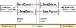 La portée de la configuration de base est de 1,4 km (0,9 mile). Le dispositif se compose d'un récepteur/émetteur dans un tuyau (tête optique) monté sur un pied robuste et réglable. Deux câbles coaxiaux sont utilisés pour connecter l'installation sur le toit avec un module traducteur installé dans la maison près d'un ordinateur ou commutateur. La portée peut être étendue à 1,9 km (1,2 mille) en doublant ou en triplant le diamètre du tuyau (et la lentille) de l'émetteur.[réf. nécessaire]