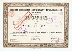 La compagnie est fondée en 1898 à Essen sous le nom de Rheinisch-Westfälisches Elektrizitätswerk Aktiengesellschaft (RWE AG - Société par actions des centrales électriques de Rhénanie-Westphalie). Sa première centrale électrique est mise en fonctionnement en 1900, elle est alors détenue en majorité par des collectivités locales. En 1903, le magnat du charbon Hugo Stinnes s'impose à la tête du directoire de la société, et conserve la présidence jusqu'à sa mort en 1924.