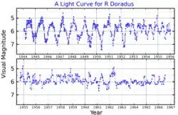 - ↑ (en) T. R. Bedding et al., « Mode switching in the nearby Mira-like variable R Doradus », Monthly Notices of the Royal Astronomical Society, vol. 301, no 4, , p. 1073–1082 (DOI 10.1046/j.1365-8711.1998.02069.x, Bibcode 1998MNRAS.301.1073B, arXiv astro-ph/9808322)