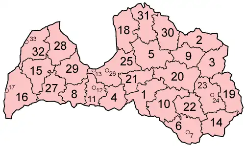 Les régions de Géorgie sont subdivisées en districts, dénommés raïoni (en géorgien : რაიონი)[4],[Note 2] pour les républiques autonomes (Abkhazie, Adjarie) et pour Tbilissi ; ils sont dénommés mounitsipalitéti (en géorgien : მუნიციპალიტეტი)[5] pour les régions administratives.