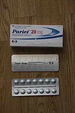 Le rabéprazole est un antisécrétoire gastrique inhibiteur de la pompe à protons[4], antiulcéreux. Il est utilisé comme tous les principes actifs de cette classe médicamenteuse pour traiter les ulcères infectieux ou non, le syndrome de Zollinger–Ellison, les excès de production d'acides dans l'estomac et dans les reflux gastro-oesophagiens.