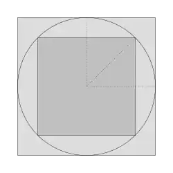 Il existe deux méthodes simples pour s'en persuader. La plus directe consiste à étudier la figure de gauche[4]. Le carré de côté 1 est composé de deux triangles, celui de côté noté est formé d'exactement quatre triangles du même type, il est donc d'aire double. Une autre manière de se rendre compte du rapport deux entre les aires des carrés de la figure est l'usage du théorème de Pythagore. Un triangle isocèle rectangle de petit côté de longueur 1 possède une hypoténuse de carré égal à . Cette hypoténuse est la diagonale d'un carré de côté de longueur 1.