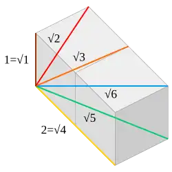 En géométrie dans l'espace, la racine carrée de 6 apparaît comme la plus grande distance entre les sommets du double cube, comme illustré à gauche. Les racines carrées de tous les entiers naturels inférieurs apparaissent comme les distances entre les autres paires de sommets du double cube (y compris les sommets des deux cubes inclus)[9].